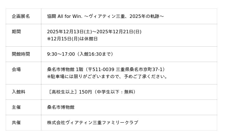 この度、ヴィアティン三重は桑名市博物館様(三重県桑名市京町37-1)と共催企画展「協闘 All for Win. ~ヴィアティン三重、2025年の軌跡~」を開催いたしますので、お知らせいたします。