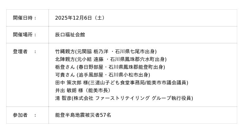当日は、地元・石川県七尾市出身の竹縄親方、先日引退を発表した鳳珠郡穴水町出身の北陣親方、鳳珠郡能登町出身の栃登さん、小松市出身の可貴さんが参加。お集まりいただいた被災者の方々にヒートテックをお渡ししたほか、石川県の食材を使用した手作りの特製ちゃんこ鍋を提供し、交流を深めました。さらに会場では、津幡町出身の横綱・大の里関とLifeWearスペシャルアンバサダーの綾瀬はるかさんからの特別ビデオメッセージをサプライズ放映。日本相撲協会考案の相撲健康体操やハートのオリジナルパネルの作成も行われるなど、心も身体も温まる時間を被災者の方々と過ごしました。