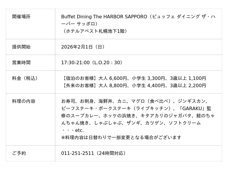 株式会社 アベストコーポレーション(代表取締役:松山 みさお)が運営するホテルアベスト札幌(支配人:山本 竜也、北海道札幌市中央区)は、2021年7月の開業以来初となるディナーバイキングを、2026年2月1日(日)から提供いたします。