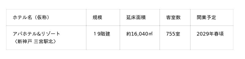 本計画は、ホテル名を「アパホテル&リゾート〈新神戸 三宮駅北〉」とし、サウナ完備の大浴場・露天風呂の他、プールやレストラン、コンビニなど様々な館内施設を備える予定であり、地上19階建・755室のホテル建設を計画し、2029年春頃の開業を目指す。神戸市内においては、アパホテル〈神戸三宮〉(全202室)、アパホテル〈神戸三宮駅前〉(全176室)が現在運営中であり、今回の計画で全3ホテル1,133室体制となる。