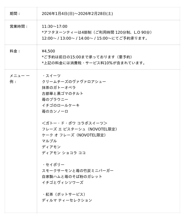 【ガトー・ド・ボワ × ノボテル奈良 いちご香る プレミアム アフタヌーンティー 開催概要】