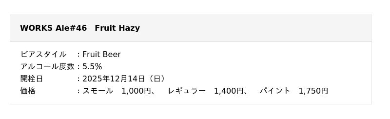 株式会社ワンダーテーブル(本社:東京都新宿区、代表取締役社長:河野博明)は、よなよなエール公式ビアレストラン「よなよなビアワークス」にて、2025年12月14日(日)より、限定クラフトビール「WORKS Ale #46 Fruit Hazy」の提供を開始いたします。