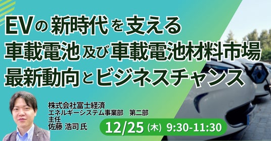 JPI(日本計画研究所)は、株式会社富士経済 エネルギーシステム事業部 第二部 主任 佐藤 浩司 氏を招聘し、EVの新時代を支える車載電池及び車載電池材料市場の最新動向とビジネスチャンスについて詳説いただくセミナーを開催します。