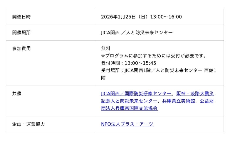 JICA関西/国際防災研修センター、阪神・淡路大震災記念人と防災未来センター、兵庫県立美術館、公益財団法人兵庫県国際交流協会によるHAT神戸連携防災イベント「イザ!美かえる大キャラバン!2026」が、2026年1月25日(日)に JICA関西 /人と防災未来センターにて開催されます。