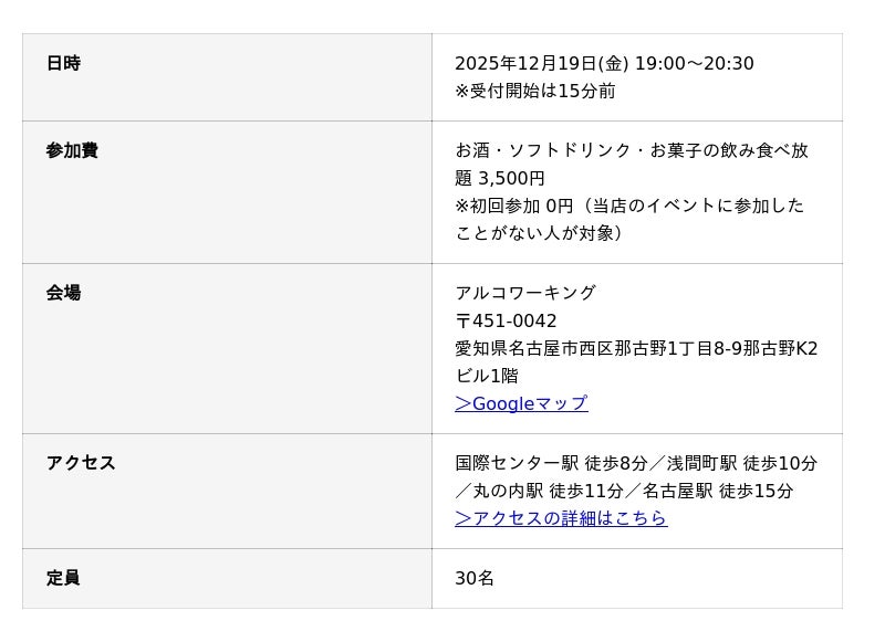 2025年12月19日(金) 19:00~20:30に、名古屋市のアルコワーキング(運営会社:室屋アフィリエイト合同会社、所在地:愛知県名古屋市西区那古野、代表:室屋清隆)にて、「アルコワ異業種交流会」が開催されます。