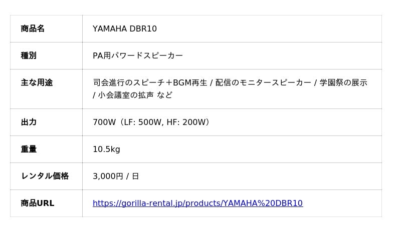 映像・配信機材レンタルサービス「ゴリラレンタル」(東京都渋谷区)は、ヤマハ製のパワードスピーカー「DBR10」のレンタル提供を開始いたしました。