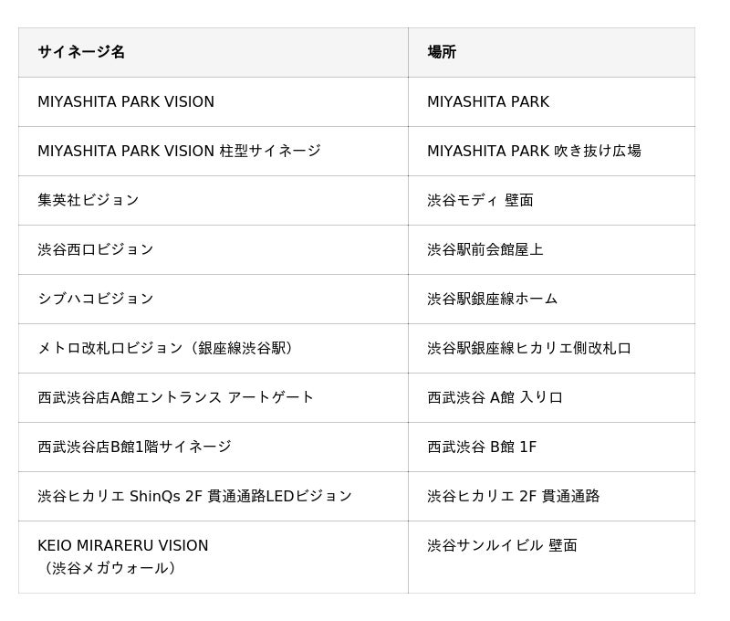 本プログラムでは、MIYASHITA PARK、渋谷PARCO、渋谷ヒカリエ、西武渋谷店、集英社ビジョン、シブハコビジョン、KEIO MIRARERU VISIONなど渋谷区内10箇所・40面以上のデジタルサイネージを活用し、街全体をデジタルアートの展示空間として開放します。