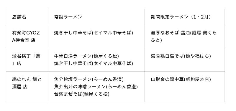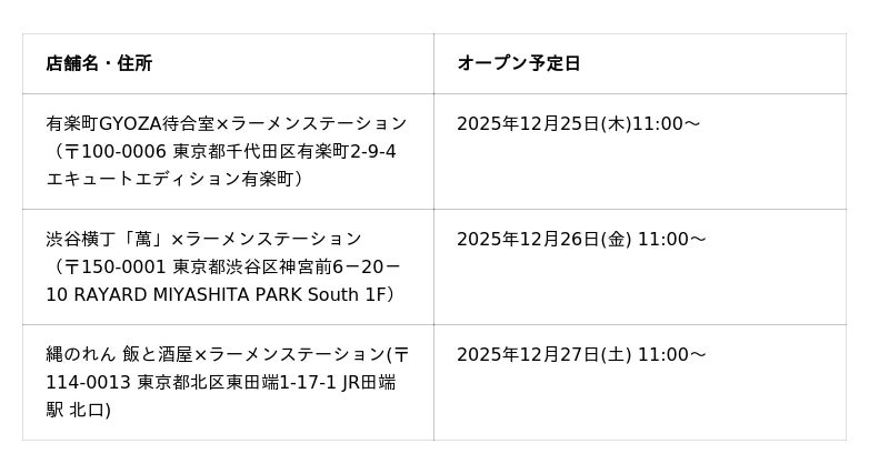 ※上記3店舗は12月下旬オープンのため、初回の期間限定ラーメンは2ヶ月超(2026年2月末日)までの提供を予定しております。