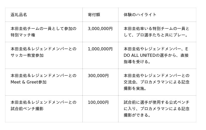 江東区をホームタウンとするサッカークラブ、EDO ALL UNITED(オーナー兼GM:本田圭佑)は、 この度、江東区のふるさと納税活用による応援企画において、特別な体験型返礼品を本日12月23日(火)よりリリースいたします 。