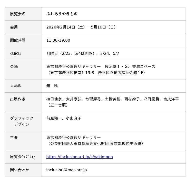 東京都渋谷公園通りギャラリーでは、2026年2月14日(土)から5月10日(日)まで、「ふれあうやきもの」展を開催いたします。