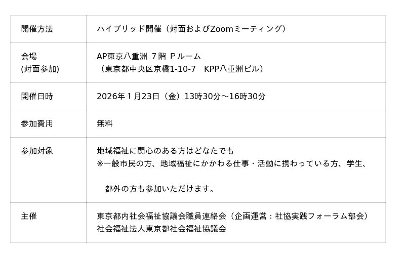 都内社協の取組みを知り、地域についてみんなで考えてみませんか?/2026年1月23日(金)開催/主催:東京都内社会福祉協議会職員連絡会、社会福祉法人東京都社会福祉協議会