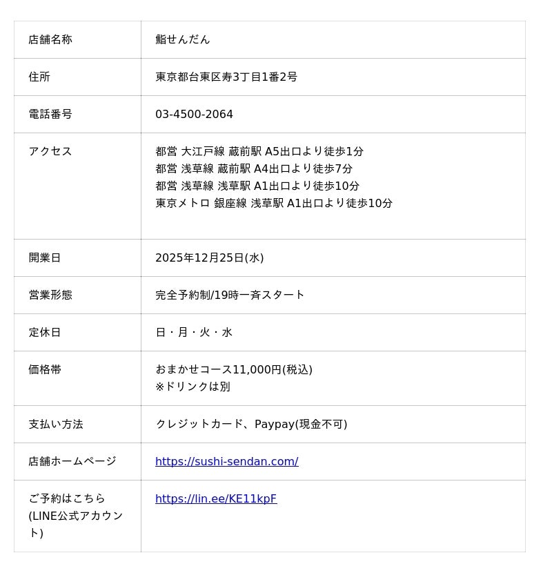 東京・蔵前に、本格江戸前鮨をコース形式で提供する鮨店「鮨 せんだん」が2025年12月25日(水)に新規開業いたします。