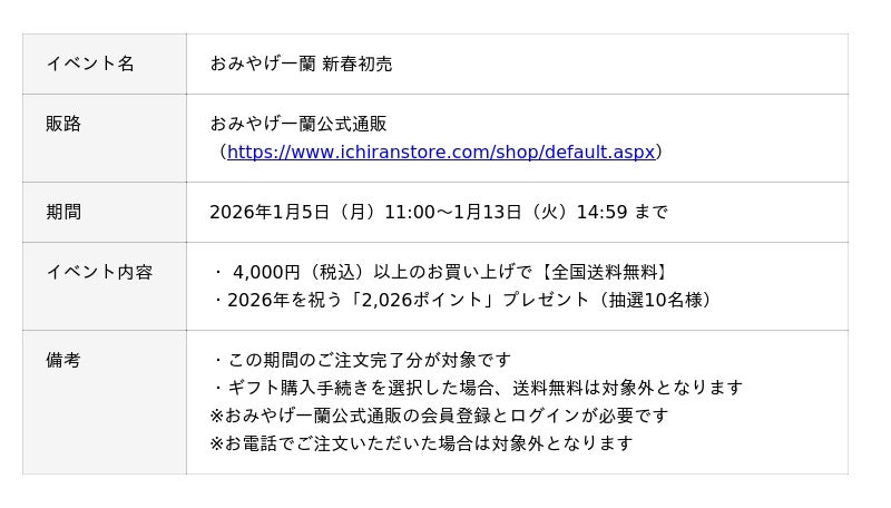 併せて開催する新春初売イベントでは、日頃のご愛顧に感謝を込めて、合計4,000円(税込)以上のお買い上げで全国送料無料となる特典をご用意いたしました。さらに、ご購入いただいた方の中から抽選で10名様に「2,026ポイント」を贈呈するお年玉企画も実施いたします。新たな一年の飛躍を願い、一蘭のこだわりが詰まった一杯で、縁起の良い「麺初め」をぜひお楽しみください。
