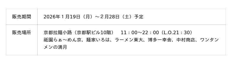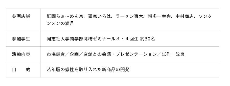京都駅ビル開発株式会社(京都市下京区、代表取締役社長 :橋本修男)が運営する「京都拉麺小路」と同志社大学商学部高橋広行ゼミナール(所在地:京都市上京区)の学生による新商品開発プロジェクトにて、コラボ商品の発売が決定しました。
