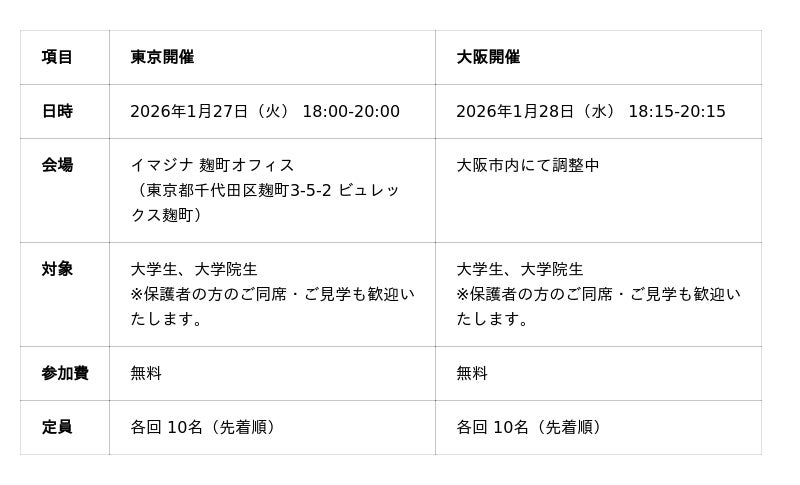 今回は、より多くの学生にこの体験を届けるため、東京・大阪の2拠点で連続開催いたします。