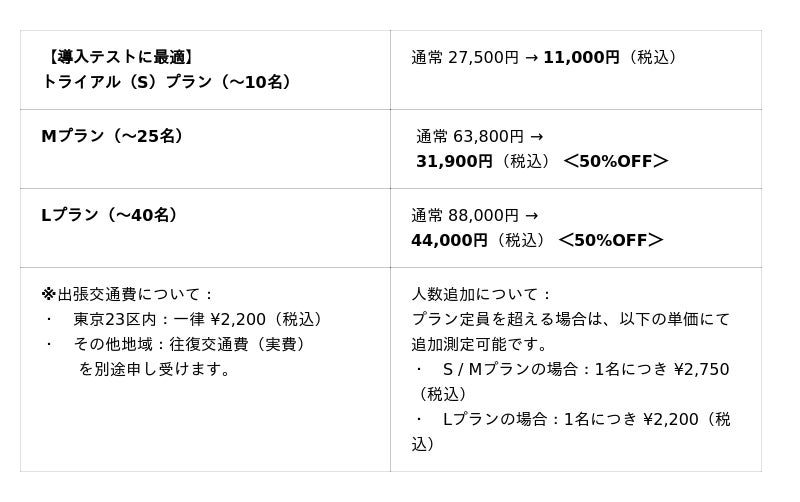 サービス本格始動を記念し、今年度末(2026年3月31日)までに実施いただける企業様を対象に、特別価格にて提供いたします。 特に大企業様・多拠点展開企業様の「導入テスト(PoC)」としても活用しやすい、11,000円(税込)のトライアルプランをご用意いたしました。対象期間: 2026年1月~3月31日実施分まで