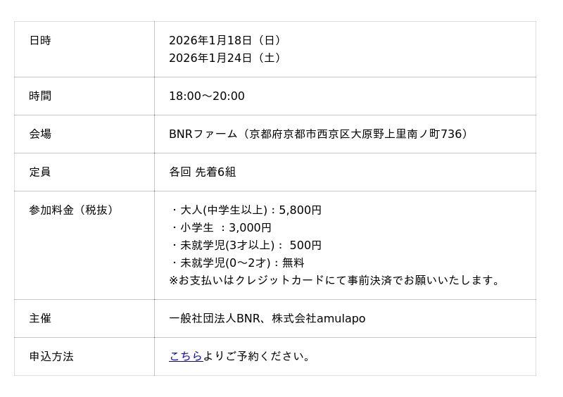 宇宙の体験をつくる研究者集団の株式会社amulapo(アミュラポ、本社:東京都新宿区、代表取締役:田中克明)は、京都で夜の野菜収穫体験ナイトファームを手掛ける一般社団法人BNR(京都府長岡京市、代表:寺島美羽)と連携し、2026年1月18日(日)・24日(土)の2日間限定で、夜の畑と宇宙体験を融合したスペシャルコラボイベント「星空ナイトファーム」を開催いたします。