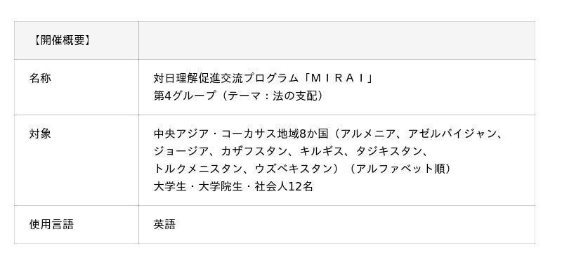 外務省が推進する国際交流事業「対日理解促進交流プログラム『MIRAI』」の一環として、中央アジア・コーカサス地域の8か国より大学生、大学院生、社会人12名が東京都と山梨県を訪問します。講義の聴講、視察、交流、文化体験を通じて、日本への理解を深めます。