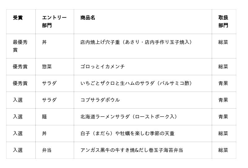 全国のスーパーマーケットやコンビニエンスストア、専門店がエントリーする「お弁当・お惣菜大賞2026」において、15,000件余りのエントリー商品の中から、サミットの7つの商品が受賞・入選を果たしました。今回は、「店内焼上げ穴子重(あさり・店内手作り玉子焼入)」が最優秀賞、「ゴロっとイカメンチ」と「いちごとザクロと生ハムのサラダ(バルサミコ酢)」が優秀賞を受賞。入選商品も含む全7品を、2月18日より期間限定で販売します。(一部、取扱いがない店舗がございます。)
