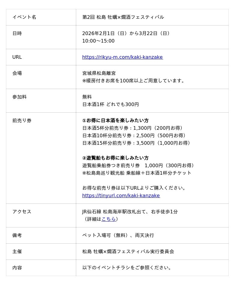 松島 牡蠣×燗酒フェスティバル実行委員会は日本三景 松島(会場:宮城県松島離宮)にて、2月1日(日)より「松島 牡蠣×燗酒フェスティバル」を開催します。
