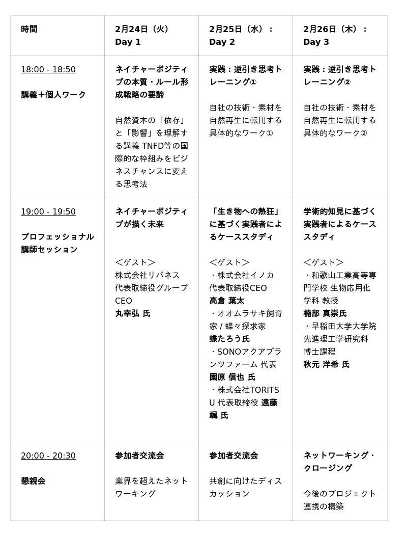 - 3回の集中講義: ネイチャーポジティブ、リジェネラティブの本質、ルール形成戦略の要諦