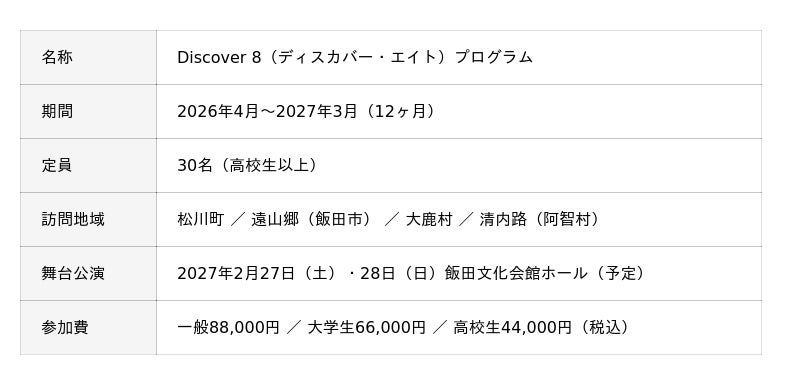 「Discover 8」は、日本の心と伝統が息づく地域をめぐり、仲間と対話を重ねながら、舞台作品(ミュージカル)を共に創り上げる12ヶ月間の体験型プログラムです。