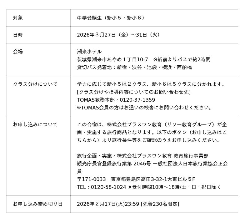 株式会社リソー教育グループ(本社:東京都豊島区、代表取締役:天坊真彦)の子会社である、株式会社TOMAS(本社:東京都豊島区、代表取締役:町田仁)は、2026年3月27日(金)~3月31日(火)に、新小5と新小6を対象に「春期特訓合宿2026」を実施いたします。