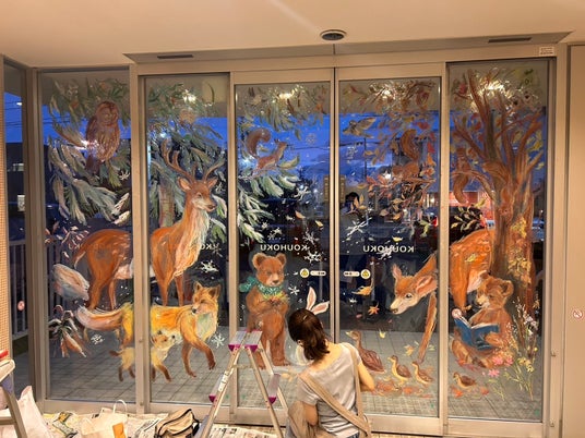 12月27日、28日の2日間でホテルロビーにてウィンドウアートを制作したアーティスト佐藤周作氏自身が現場でアート制作中の雰囲気を感じています。