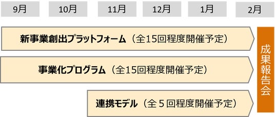 大企業等の民間企業で培われたノウハウやアイデアを起業や新事業創出に結びつけるため、起業家やベンチャーキャピタリスト、各分野のプロフェッショナルの方々に協力いただき支援しています。以下とおり、「新事業創出プラットフォーム」と「事業化プログラム」という2つのコースに分け、講義やワークショップ、個別メンタリングを実施しています。