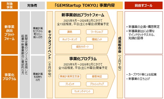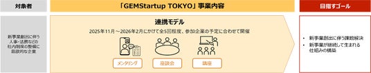 本事業(GEMStartup TOKYO)は、大企業等の民間企業に眠る優れたアイデア、人材や技術シーズを発掘することを目的とした、東京都による新事業創出プロジェクトです。