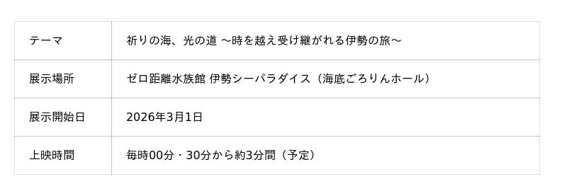 株式会社ネイキッド(英語表記:NAKED, INC. 所在地:東京都渋谷区、代表:村松亮太郎、以下「ネイキッド」)は、「ゼロ距離水族館 伊勢シーパラダイス」(三重県伊勢市)にて株式会社伊勢夫婦岩パラダイスおよび株式会社JTBが共同で展開する「ISE Digital ART PROJECT」へ展示協力し、由緒ある“浜参宮”から始まる伊勢参りの文化的価値をデジタルアートで体感できる新たな水槽展示を、2026年3月1日(日)より開始することをお知らせします。