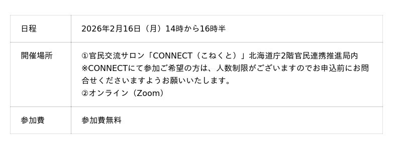 2026年2月16日(月)14時から、会場(官民交流サロン「CONNECT(こねくと)」)及びオンライン同時配信にて開催いたします。
