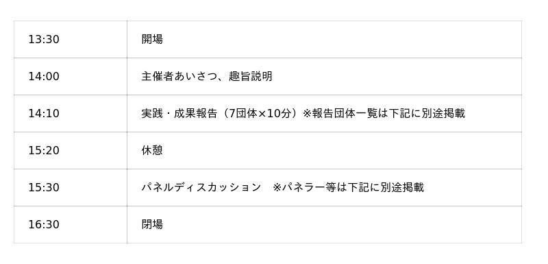 当該事業において実践された団体の活動報告や成果発表を行います。また、事業が終了した後も、引き続き事業を行っていくために各地域の行政機関や関係各所と、今後の展望等についてパネルディスカッション等を通じて意見交換を行います。