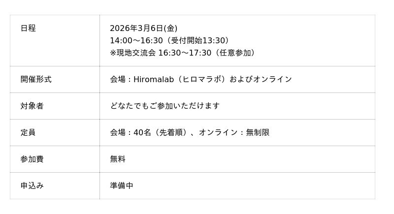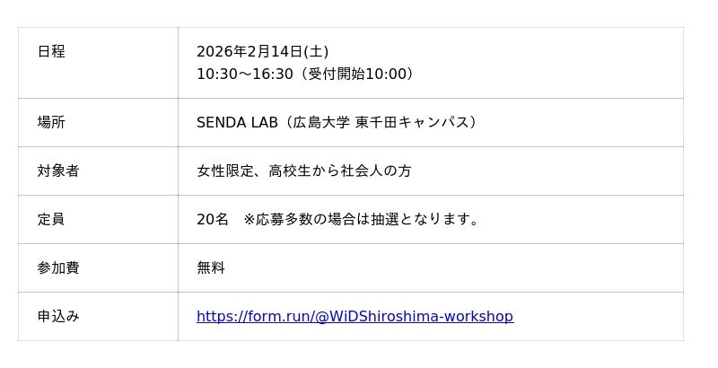株式会社Rejoui(リジョウイ、代表取締役:菅由紀子)が運営する「WiDS HIROSHIMA(ウィズひろしま)」は、ワークショップとシンポジウムを広島市内で開催します。このイベントは、データやAIを「自分の未来を考えるための身近なツール」として捉え、地元でのキャリアの可能性について考える場を目指しています。