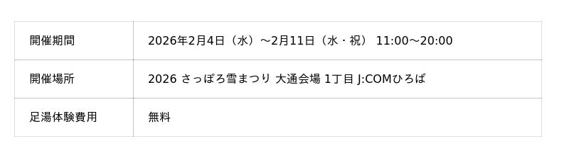 北海道のスキンケアメーカー 株式会社ナチュラルアイランドは、2026年2月4日~11日の「2026 さっぽろ雪まつり」大通会場1丁目に「アロマの足湯」を出展。心も体も温まる体験を提供します。