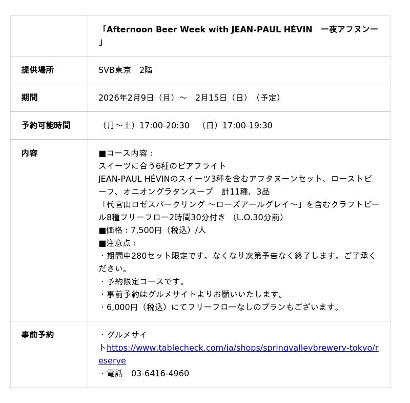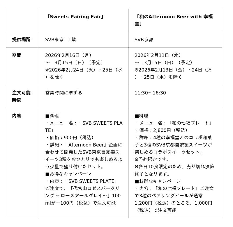 クラフトビールブランド「SPRING VALLEY BREWERY」の直営店を運営する、スプリングバレーブルワリー株式会社(社長 井本亜香、以下SVB)は、2026年の企画第1弾として、スイーツとクラフトビールの組み合わせを楽しむアフタヌーンティーをモチーフにした企画「Afternoon Beer」を2026年2月9日(月)よりスプリングバレーブルワリー東京(以下SVB東京)とスプリングバレーブルワリー京都(以下SVB京都)両店にて順次開催します。2024年11月にSVB東京・SVB京都両店にて実施した同テーマの企画(※)にて、お客様から好評をいただき、今年はさらに内容に磨きをかけて展開します。SVB東京ではパリのショコラティエJEAN-PAUL HEVIN(ジャン=ポール・エヴァン)のスイーツを含む夜しか味わえないセットメニュー、SVB京都では京都の老舗和菓子屋幸福堂(コウフクドウ)とのコラボ和菓子を含むセットメニューが新登場します。