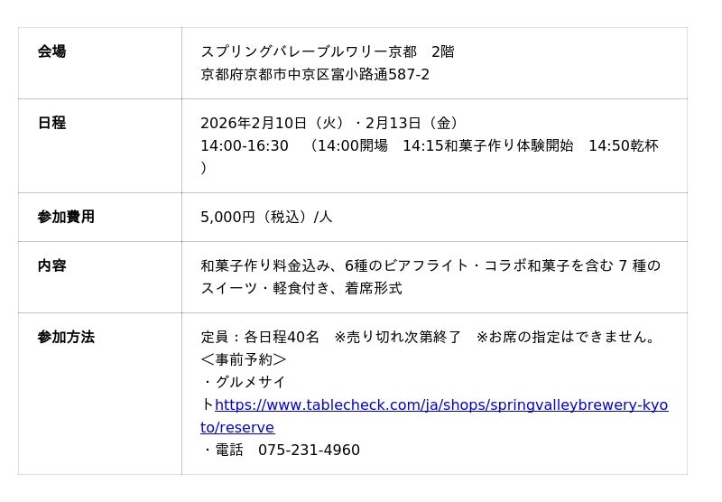 2026年2月10日(火)・2月13日(金)の2日間限定で開催します。和菓子作り体験と、和菓子とクラフトビールのペアリングが一度に楽しめる限定イベントです。SVB京都からほど近い、明治元年創業の老舗和菓子屋「幸福堂」とコラボし、クラフトビールとの相性を吟味したオリジナル和菓子を4種開発しました。さらに、SVB京都こだわりの“和クラフト”スイーツ3種も含むセットをご用意しました。イベント当日は、和菓子職人による和菓子作り体験や、SVB京都ヘッドブリュワーによるペアリングの解説を通して、京都ならではの、和菓子とクラフトビールの組み合わせを堪能ください。