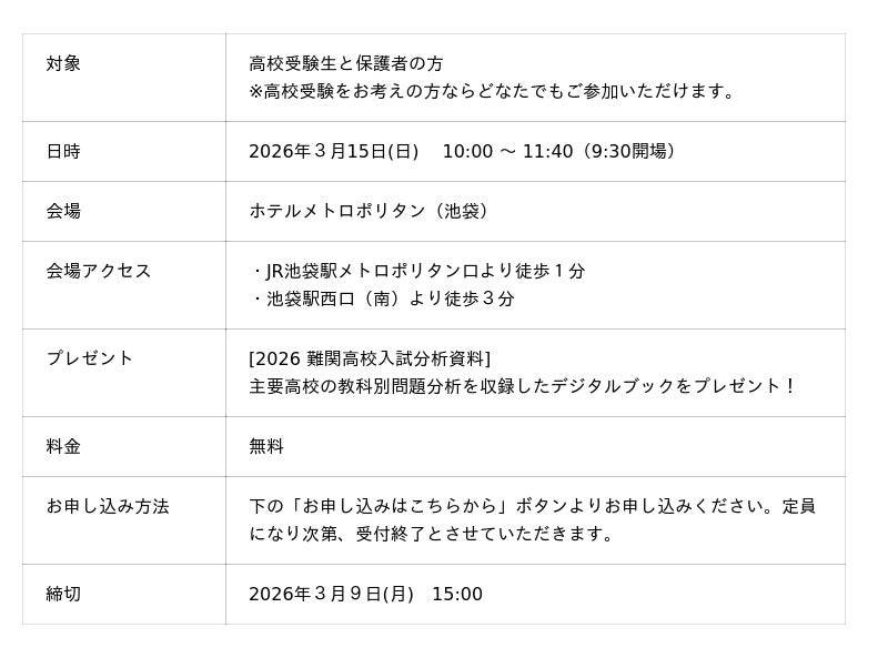 最新の入試問題を徹底分析!難関高校合格のための具体策と、合格者の生の声をお伝えします。【日時】3/15(日)10:00~11:40 【会場】ホテルメトロポリタン(池袋)