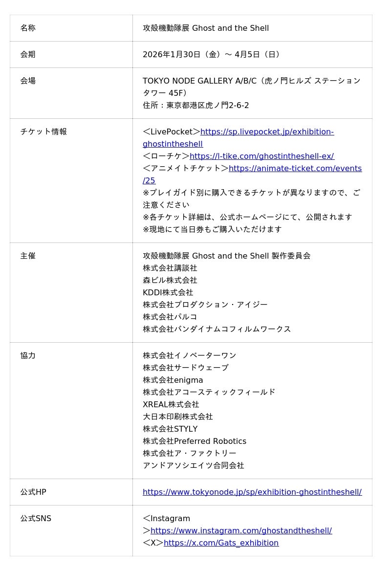 攻殻機動隊展 Ghost and the Shell 製作委員会(株式会社講談社、森ビル株式会社、KDDI株式会社、株式会社プロダクション・アイジー、株式会社パルコ、株式会社バンダイナムコフィルムワークス)は、2026年1月30日(金)から4月5日(日)まで、虎ノ門ヒルズ ステーションタワー45Fの情報発信拠点「TOKYO NODE(東京ノード)」内 TOKYO NODE GALLERY にて開催する『攻殻機動隊展 Ghost and the Shell』の会期中特別イベント(第二弾情報)を公開します。本展は『攻殻機動隊』アニメ化30周年を記念し、作品世界を“鑑賞”にとどめず、対話・音楽・映像表現を通して、現代へ拡張するイベントプログラムを展開します。