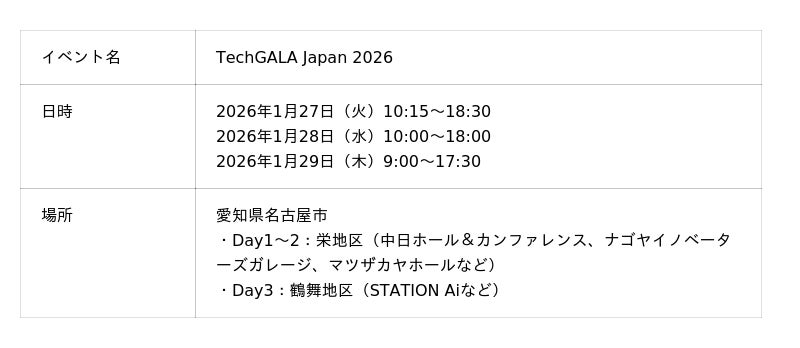一般社団法人中部経済連合会、名古屋大学、愛知県、名古屋市、浜松市等で構成され、当地域のスタートアップ・エコシステムの形成を目指す「Central Japan Startup Ecosystem Consortium」が主催するグローバルイベント「TechGALA Japan 2026」において、2日目となる1月28日(水)にピッチコンテスト「Grand Pitch 2026」を開催しました。