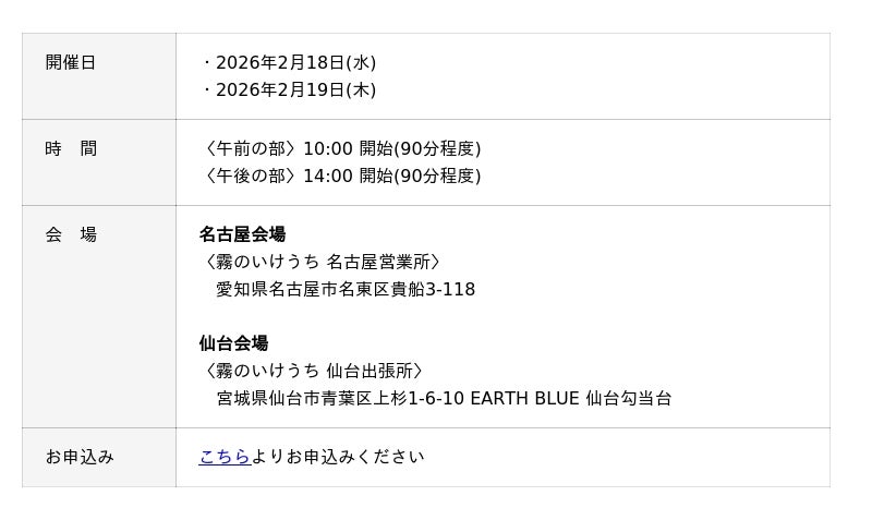 株式会社いけうち(霧のいけうち、本社:大阪府大阪市西区)は、令和8年2月に全国5拠点(東京・大阪・名古屋・福岡・仙台)で "産業用ドライフォグ加湿システム体験会" を開催いたします。