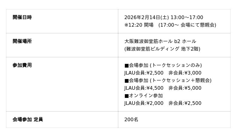 JLAU (一般社団法人ランドスケープアーキテクト連盟) は、2/14(土)に大阪難波御堂筋ホールにて『万博とは何だったのか?』をテーマに、会場デザインプロデューサーを務められた藤本壮介氏とランドスケープデザインを手がけた忽那裕樹氏 (JLAU副会長) によるトークセッションを開催いたします。プログラム後半では、自分たちの街を万博会場に見立てその価値を街に残す活動を行う「まちごと万博」、万博の跡地利用や大阪市全体のまちづくりを構想する「GREEN ARROW」に関するセッションも行います。