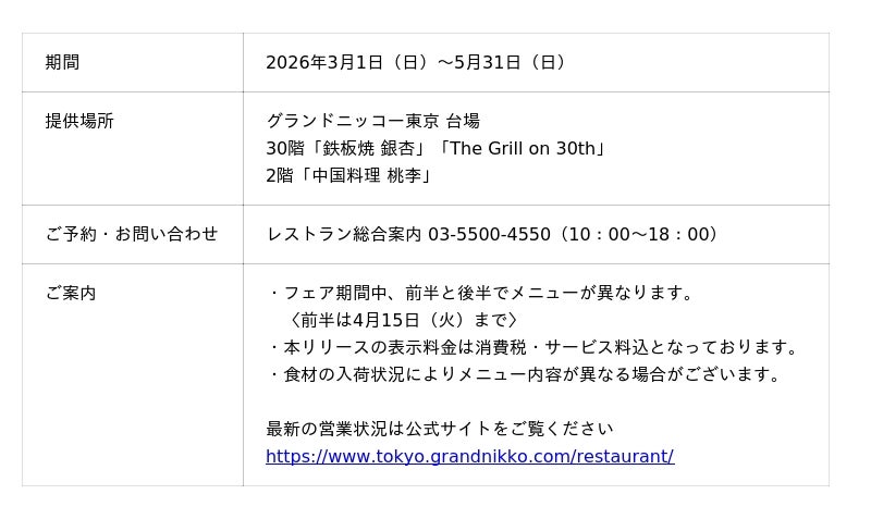 「東京を楽しむ 東京をくつろぐ」ひとときをお届けするグランドニッコー東京 台場(住所:東京都港区 総支配人:塚田 忠保)は、「鉄板焼 銀杏」「The Grill on 30th」「中国料理 桃李」にて、『ガストロノミープラン ~富山フェア~』を2026年3月1日(日)~5月31日(日)の期間限定で開催いたします。