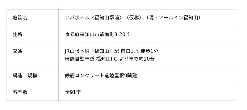 アパホテルネットワークとして1,042ホテル141,563室(建設・計画中ホテル、FC、MC、提携を含む)を展開するアパホテル株式会社(本社:東京都港区赤坂3丁目2-3 代表取締役社長:元谷芙美子)は、株式会社R・INN(本社:京都府福知山市駅南町3-20-1 代表取締役:家田 龍一)とフランチャイズ契約を締結し、同社が運営するアールイン福知山をアパホテル〈福知山駅前〉(仮称)(全91室)として、2026年5月(予定)にオープンすることに合意した。