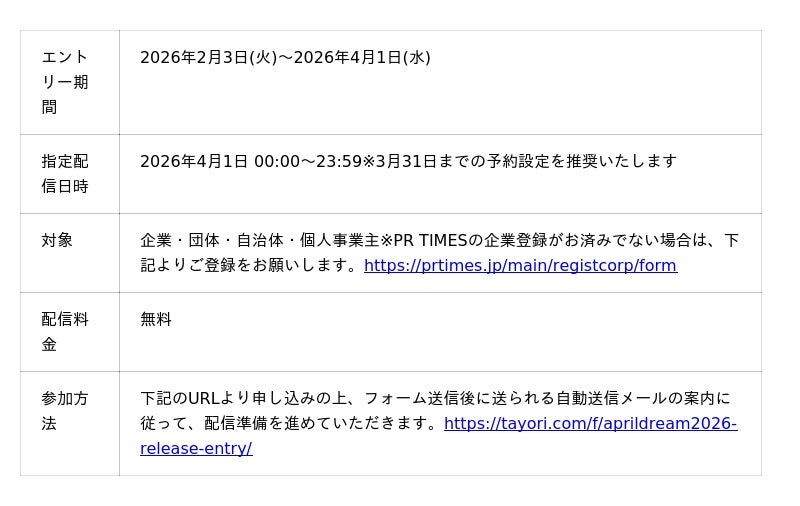 特定の場所や特定の人だけが夢を発信するのではなく、あらゆる場所、あらゆる人が夢を語り、夢の実現のために行動する。4月1日をそんなきっかけの日に。PR TIMESとDreamパートナーはApril Dreamが日本の文化となり、誰もが当たり前に夢を発信する未来を目指しています。夢は言葉にしてみることで、自分自身との約束になり行動につながります。そして、夢を知って応援してくれる人が現れ、実現に近付くきっかけになります。そんなきっかけとなる場所や機会に、全国の誰もが参加できる未来は、PR TIMESだけでは実現できません。その業界や、その地に、根差して活動している企業・団体・組織の皆様がDreamパートナーとして場を作っていただくことで初めて、自らの夢を発信できるようになる人もいるかもしれない。一人でも多くの人が、自らの夢を発信し、行動するきっかけとなる4月1日を迎えられるよう、2026年もDreamパートナーの皆様と共に夢の発信を応援してまいります。