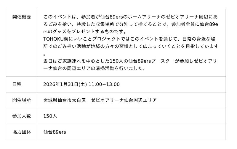 一般社団法人TOHOKU海にいいことプロジェクト(宮城海ごみなくし隊)は、2026年1月31日(土)に生活の中での街のごみ拾い活動の習慣化を目的として、仙台89ersと連携した「ごみを拾って仙台89ersを黄援しよう!」を開催いたしました。