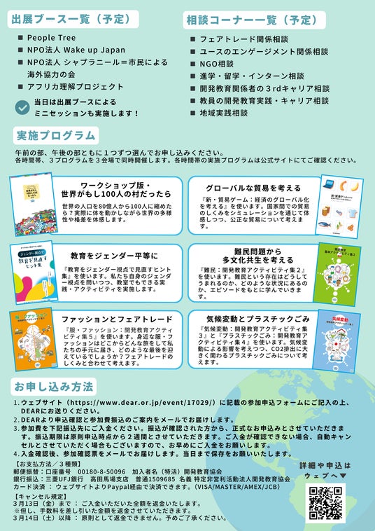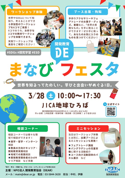 認定NPO法人開発教育協会(DEAR/東京都文京区)は、2026年3月28日(土)、体験型で世界の課題を学ぶイベント「まなびDE(開発教育)フェスタ~世界を知るってたのしい!学びと出会いがめぐる1日。~」を、JICA地球ひろば(東京都新宿区)にて開催します。
