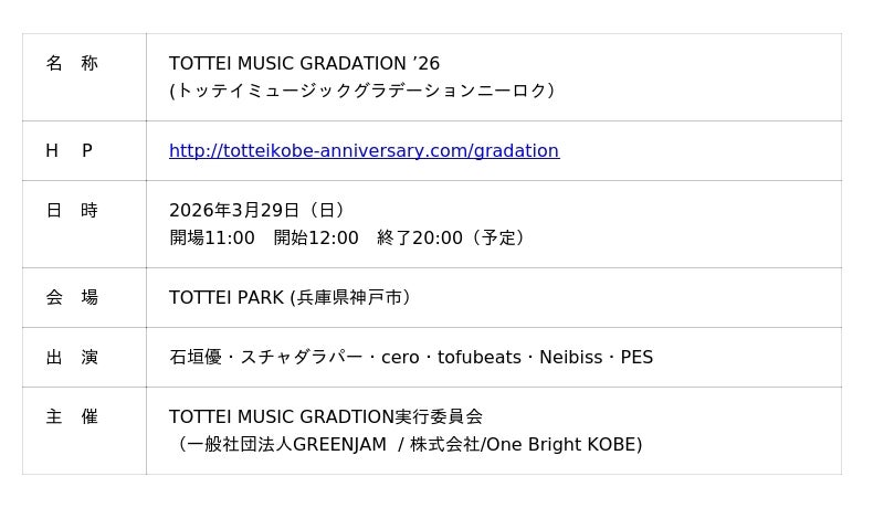 株式会社One Bright KOBE(住所:神戸市中央区、代表取締役社長 渋谷 順)では、「TOTTEI KOBE 開港祭 1st ANNIVERSARY」開催期間中となる3月29日(日)に、「TOTTEI MUSIC GRADATION ‘26」を開催します。