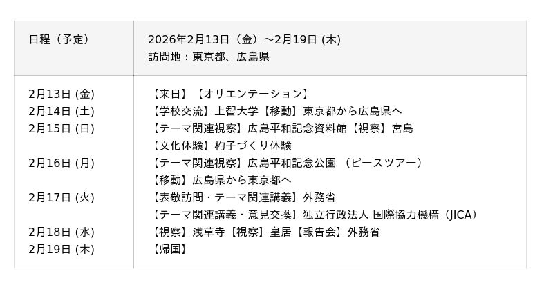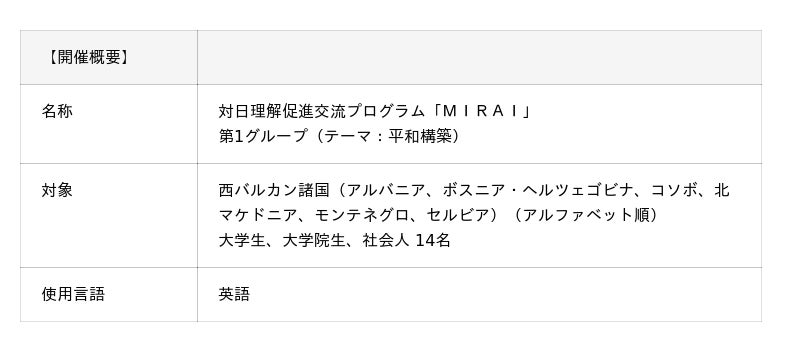 外務省が推進する国際交流事業「対日理解促進交流プログラム『MIRAI』」の一環として、西バルカン諸国から14名の大学生、大学院生、社会人が東京都と広島県を訪問します。講義の聴講、視察、交流、文化体験を通じて、日本への理解を深めます。