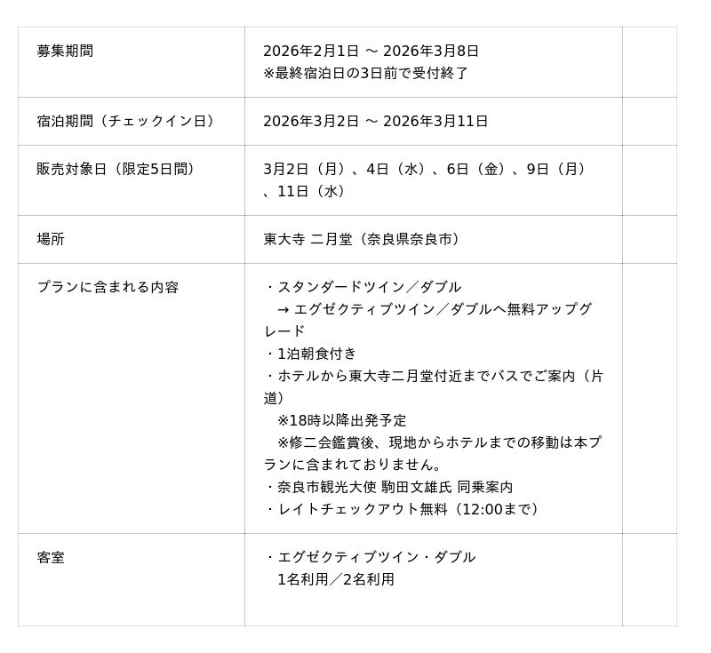 ノボテル奈良(所在地:奈良県奈良市)は、2026年3月に奈良・東大寺二月堂で行われる伝統行事「修二会(十一面悔過法要)」の鑑賞に特化した宿泊プラン「東大寺修二会鑑賞プラン」を、期間・日程限定で販売いたします。
